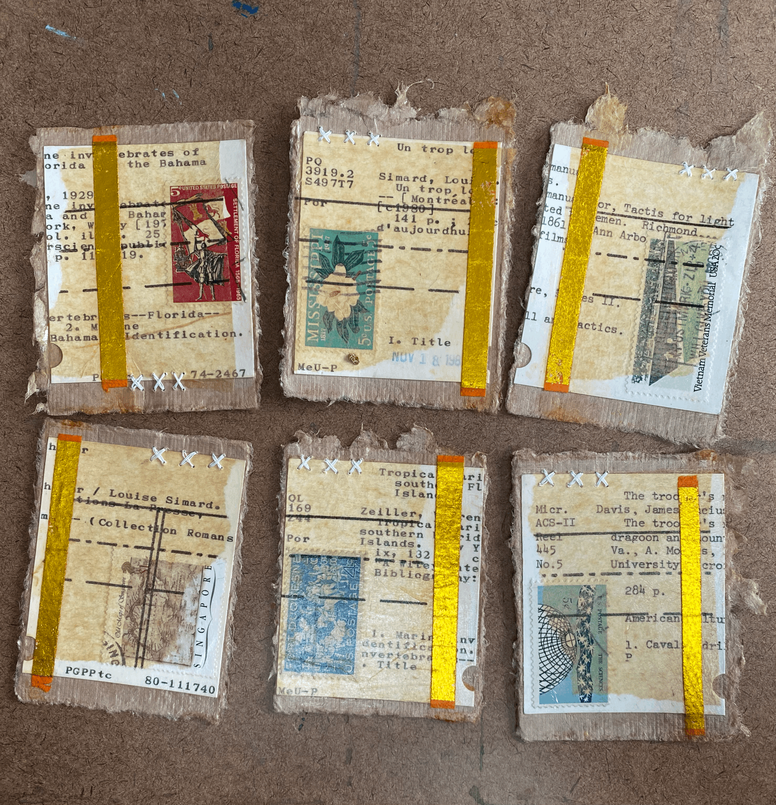 Artist trading cards are about the size of a business card. Often, I will create a small batch of playful artist trading cards. It is a chance to play, explore and discover. Finding other artists to trade with is easy in this day of social media. I have a growing collection of cards form around the world!